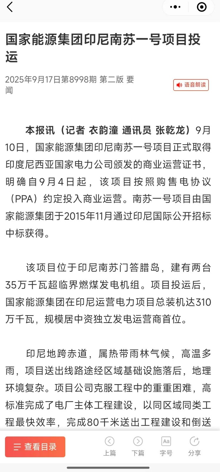 中国电力报:国家能源集团印尼南苏一号项目投入商业运营9月10日,国家能源集团印尼南苏一号... [详情]