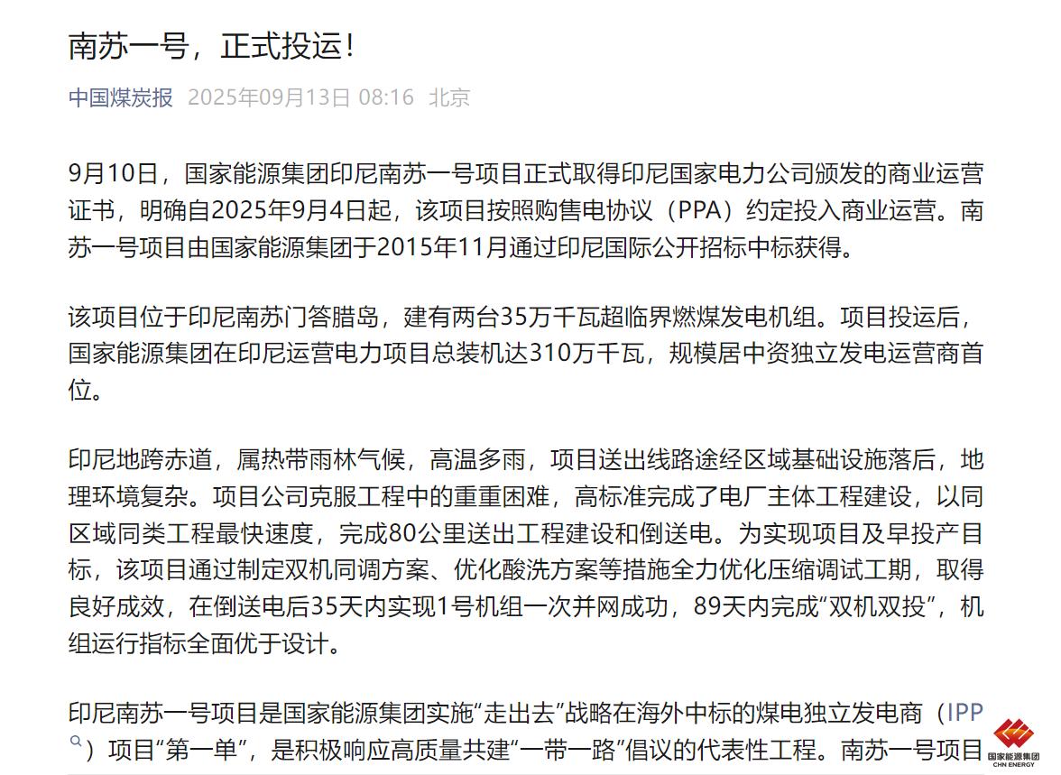 9月10日,国家能源集团印尼南苏一号项目正式取得印尼国家电力公司颁发的商业运营证书,明确自2025年9月4日起,该项目按照购售电协议(PPA)约定投入商业运营。南苏一号项目由国家能源集团于2015年11月通过印尼国际公开招标中标获得。