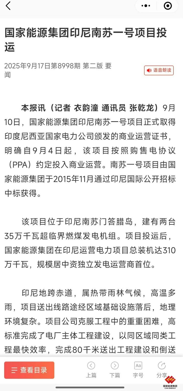 中国电力报:国家能源集团印尼南苏一号项目投入商业运营