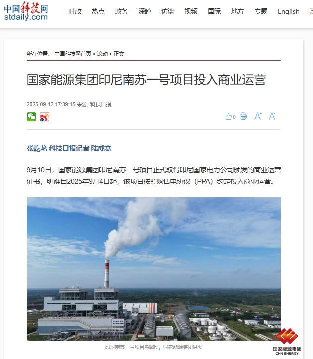 中国科技网:国家能源集团印尼南苏一号项目投入商业运营