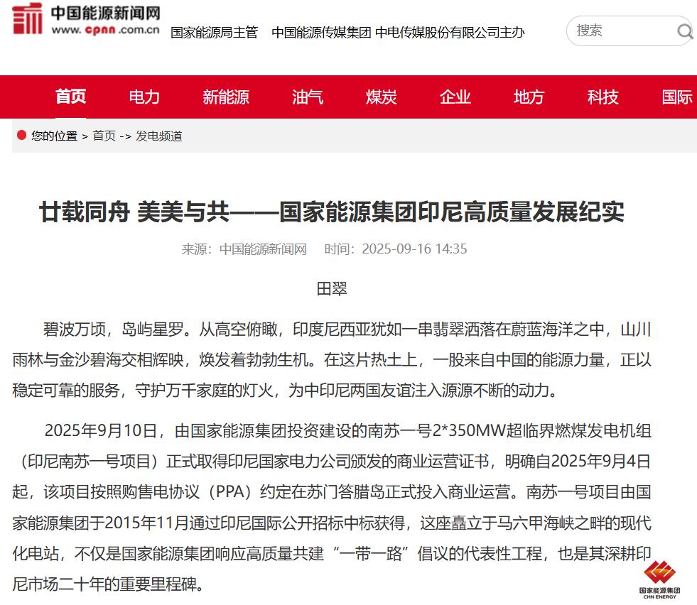 2025年9月10日,由国家能源集团投资建设的南苏一号2*350MW超临界燃煤发电机组(印尼南苏一号项目)正式取得印尼国家电力公司颁发的商业运营证书,明确自2025年9月4日起,该项目按照购售电协议(PPA)约定在苏门答腊岛正式投入商业运营。南苏一号项目由国家能源集团于2015年11月通过印尼国际公开招标中标获得,这座矗立于马六甲海峡之畔的现代化电站,不仅是国家能源集团响应高质量共建“一带一路”倡议的代表性工程,也是其深耕印尼市场二十年的重要里程碑。