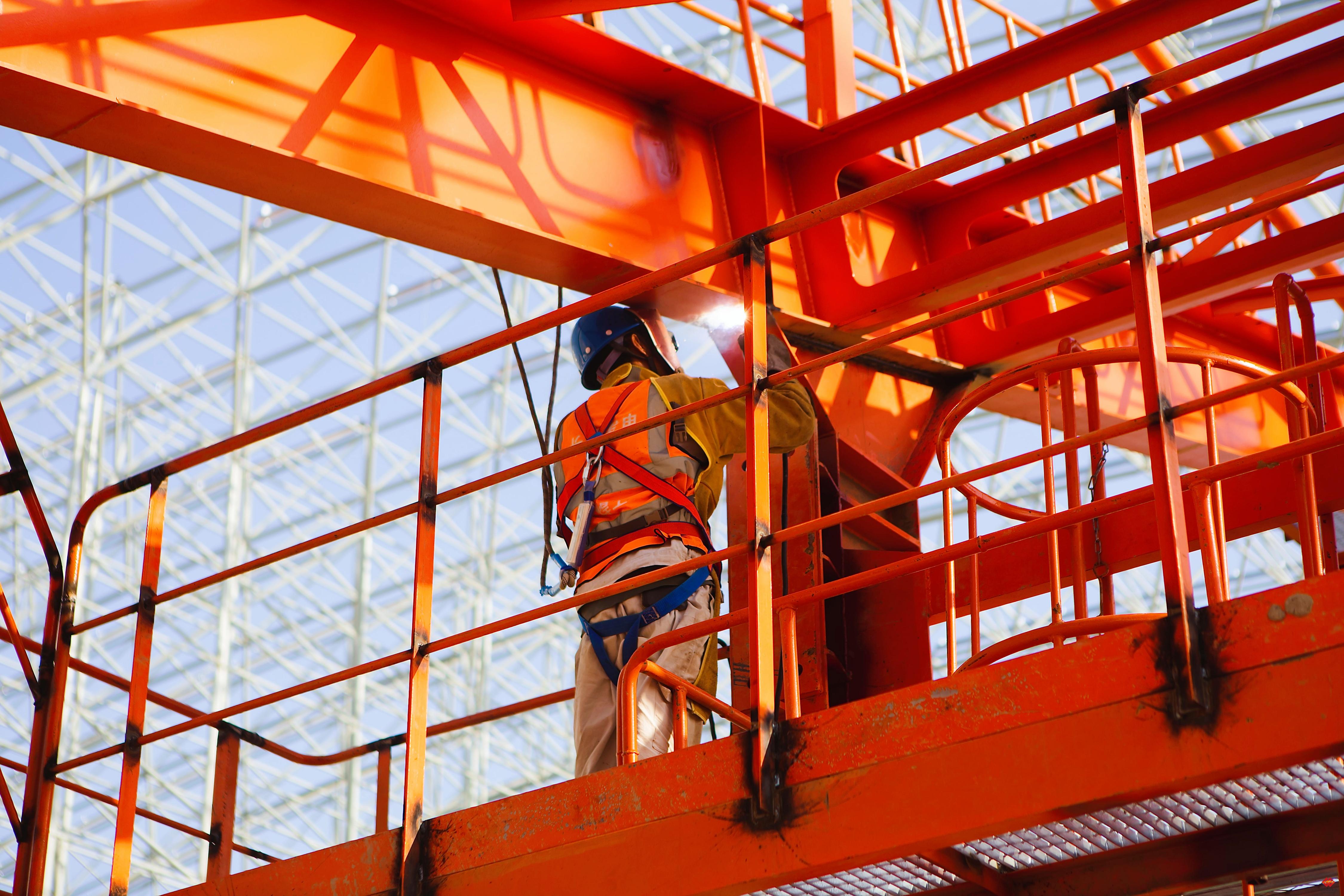 图为施工人员焊接斗轮机大臂。聚焦输煤系统核心设备安全运行需求,该公司以严苛标准严控斗轮机大臂焊接的强度,通过细化焊接工艺参数、强化焊缝检测验收等举措,确保设备结构稳固可靠。
