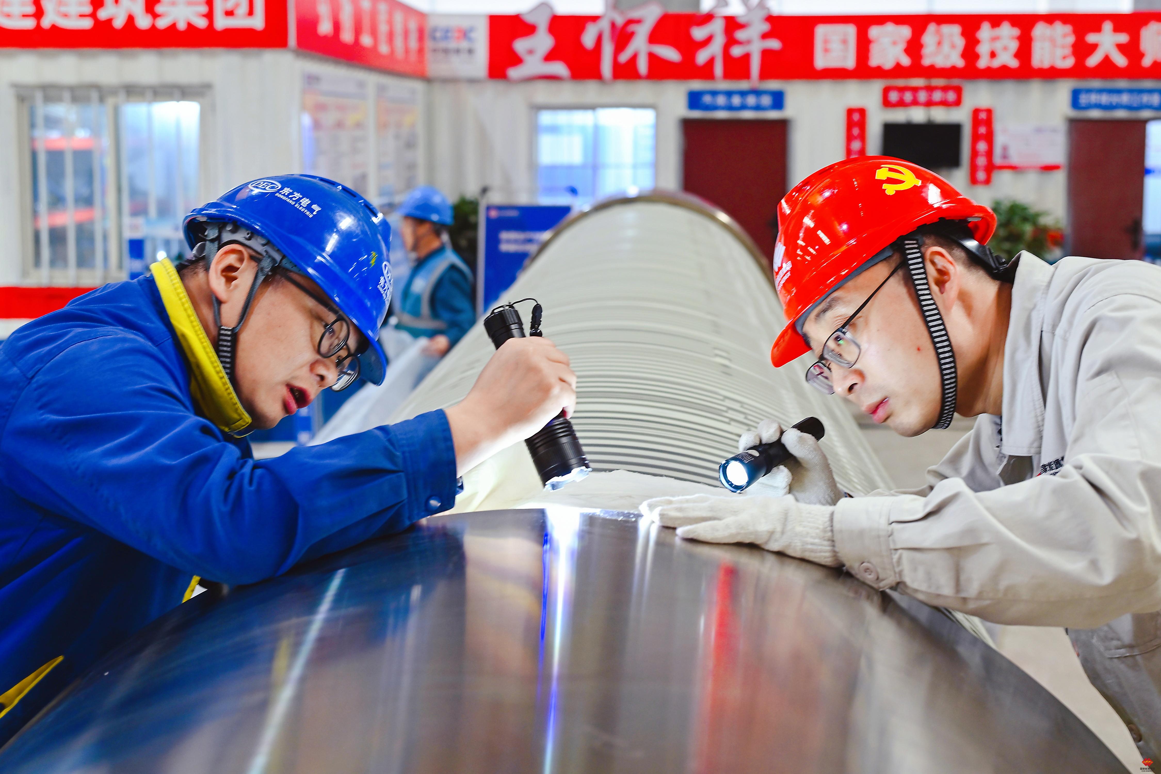 图为发电机转子穿装前,工作人员细致检查转子通风孔及月牙槽状态。该公司将隐患排查关口前移至装配准备阶段,通过对关键部件的尺寸精度、结构完整性进行逐项核验,彻底排除潜在故障风险,确保转子穿装工序零缺陷推进。